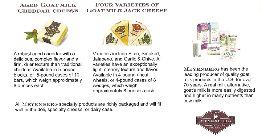GOAT MILK CHEESES PAGE 1 -- PAGE 2 -- PAGE 3 -- BACK TO MAIN MEYENBERG LINE